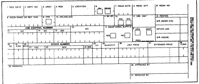 Figure 1-1.-NAVSUP 1250. purposes, all labor is classified as either productive or overhead. Labor codes are shown in figure 1-2. Productive labor either directly or indirectly contributes to the completion of the unit's mission, including construction operations and training. It is broken down into four categories: direct labor, indirect labor, military operations and readiness, and training. Direct labor includes labor expended directly on assigned construction tasks contributing directly to the completion of an end product. It can be either in the field or in the shop. Direct labor must be reported separately for each assigned construction task. Indirect labor is labor required to support construction operations but not producing an end product itself. Military operations and readiness includes work necessary to ensure the unit's military and mobility readiness. It consists of all manpower expended in actual military operations, unit embarkation, and planning and preparations. Training includes attendance at service schools, factory and industrial courses, fleet-level training and short courses, military training, and organized training conducted within the battalion or unit. Overhead labor, compared to productive labor, does not contribute directly or indirectly to the completion of an end product. It includes labor that must be performed regardless of the assigned mission. During project planning and scheduling, each direct labor phase of the project is given an identifying code. For example, excavating and setting forms may be assigned code R-15; laying block, code R-16; and installing bond beams, code R-17. (Since there are many types of construction