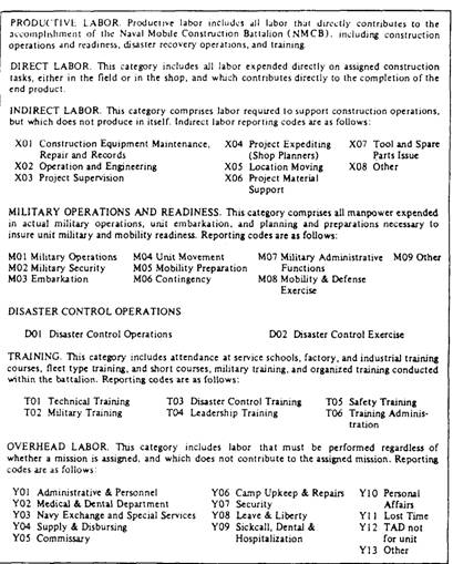 Figure 1-2.-Labor codes. projects involving different operations, codes for direct labor may vary from one activity to another.) Use direct labor codes in reporting each hour spent by each of your crewmembers during each workday on an assigned activity code. Submit your reports on a daily labor distribution report form (timekeeping card). Views A and B of figure 1-3 show typical timekeeping cards. The form provides a breakdown, by man-hours, of the activities in the various labor codes for each crewmember for each day on any given project. The form is reviewed at the company level by the staff and platoon commander. The company commander then initials the report and sends it to the operations department. The management division of the operations department tabulates the report, along with those received from all other companies and departments in the unit. This consolidated report is the means by which the operations office analyzes the labor