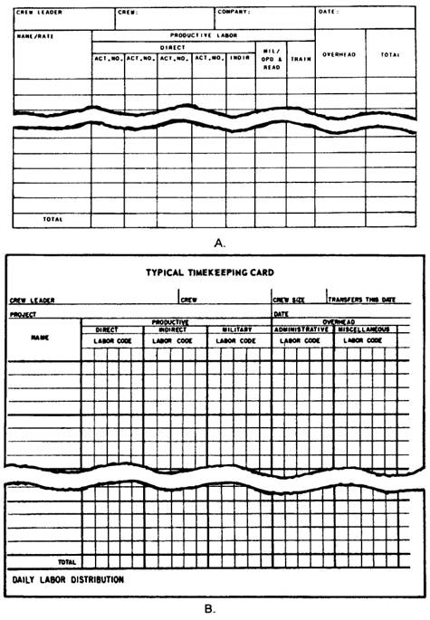 PREPARING REQUISITIONS As a crew leader, you must become familiar with the forms used to request material or services through the Navy Supply System. Printed forms are available that provide all the information necessary for the physical transfer of the material and accounting requirements. The form you will use most often is NAVSUP Form 1250, shown in figure 1-1. Crew leaders are not usually required to complete the entire form. However, you must list the stock number of the item, when available, the quantity required, and the name or description of each item needed. Turn this form in to the expediter, who checks it, fills in the remaining information, and signs it. The form then goes to the material liaison officer (MLO) or supply department for processing. In ordering material, you need to know about the national stock number (NSN) system. Information on the NSN system and other topics about supply is given in Military Requirements for Petty Officer Third Class, NAVEDTRA 12044. TIMEKEEPING In both battalion and shore-based activities, you will be posting entries on time cards for military personnel. You need to know the type of information called for on the cards and understand the importance of accuracy in labor reporting. The reportings systems used primarily in naval mobile construction battalions (NMCBs) and the system employed at shore-based activities are similar. A labor accounting system is used to record and measure the number of man-hours a unit spends on various functions. Labor utilization information is collected every day in sufficient detail and manner to allow the operations department to readily compile the data. This helps the operations officer to both manage manpower resources and prepare reports for higher authority. Although labor accounting systems may vary slightly from one command to another, the system described here is typical. Each work unit accounts for all labor used to carry out its assignment. This lets management determine the amount of labor used on the project. Labor costs are figured, and actual man-hours are compared with other similar jobs. When completed, unit managers and higher commands use this information to develop planning standards. The type of labor performed must be broken down and reported by category to show how labor has been used. For timekeeping and labor reporting
