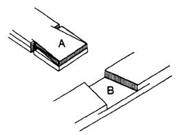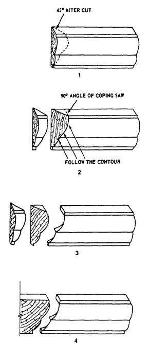 Figure 3-62.-Making a dovetail half-lap joint. A multiple dovetail joint is shown in figure 3-63; figure 3-64 indicates how the waste is chiseled from the multiple joint. Box Corner Joints With the exception of the obvious difference in the layout, the box corner joint (figure 3-48) is made in a similar manner as the through-multiple-dovetail joint. Coping Joints Inside corner joints between molding trim members are usually made by butting the end of one member against the face of the other. Figure 3-65
