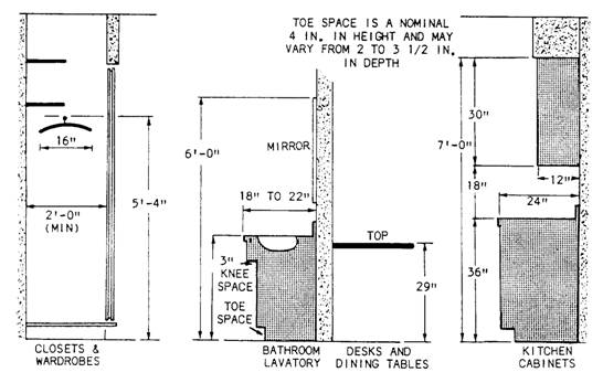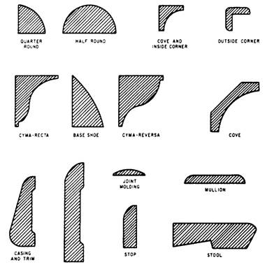 Figure 3-67.-Typical dimensions for cabinetwork. shows the method of shaping the end of the abutting member to tit the face of the other member. First, saw off the end of the abutting member square, as you would for an ordinary butt joint between ordinary flat-faced members. Then, miter the end to 45, as shown in the first and second views of figure 3-65. Set the coping saw at the top of the line of the miter cut, hold the saw at 90 to the lengthwise axis of the piece, and saw off the segment shown in the third view, following closely the face line left by the 45 miter cut. The end of the abutting member will then match the face of the other member, as shown in the third view. A joint made in this reamer is called a coping joint. You will have to cut coping joints on a large variety of moldings. Figure 3-66 shows the simplest and most common moldings and trims used in woodworking. |