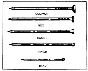 COUNTERS AND TOPS In cabinetwork, the counters and tops are covered with a 1/16-inch layer of high-pressure plastic laminate. Although this material is very hard, it does not possess great strength and is serviceable only when it is bonded to plywood, particle board, or wafer wood. This base, or core material, must be smooth and is usually 3/4-inch thick. Working Laminates Plastic laminates can be cut to rough size with a table saw, portable saw, or saber saw. Use a fine-tooth blade, and support the material close to the cut. If no electrical power is available, you can use a finish handsaw or a hacksaw. When cutting laminates with a saw, place masking tape over the cutting area to help prevent chipping the laminate. Make cut markings on the masking tape. Measure and cut a piece of laminate to the desired size. Allow at least 1/4-inch extra to project past the edge of the countertop surface. Next, mix and apply the contact bond cement to the underside of the laminate and to the topside of the countertop surface. Be sure to follow the manufacturer's recommended directions for application. Adhering Laminates Allow the contact bond cement to set or dry. To check for bonding, press a piece of waxed brown paper on the cement-coated surface. When no adhesive residue shows, it is ready to be bonded. Be sure to lay a full sheet of waxed brown paper across the countertop. This allows you to adjust the laminate into the desired position without permanent bonding. Now, you can gradually slide the paper out from under the laminate, and the laminate becomes bonded to the countertop surface. Be sure to roll the laminate flat by hand, removing any air bubbles and getting a good firm bond. After sealing the laminate to the countertop surface, trim the edges by using either a router with a special guide or a small block plane. If you want to bevel the countertop edge, use a mill file. METHODS OF FASTENING LEARNING OBJECTIVE: Upon completing this section, you should be able to identify the different types of fastening devices. A variety of metal fastening devices are used by Seabees in construction. Although nails are the most commonly used fastener, the use of staples to attach wood structural members is growing. For certain operations, screws and bolts are required. In addition, various metal devices exist for anchoring materials into concrete, masonry, and steel. The increasing use of adhesives (glues and mastics) is an important development in the building industry. Adhesives are used in combination with, or in place of, nails and screws. NAILS Nails, the most common type of metal fasteners, are available in a wide range of types and sizes. Basic Nail Types Some basic types are shown in figure 3-75. The common nail is designed for rough framing. The box nail is used for toenailing and light work in frame construction. The casing nail is used in finished carpentry work to fasten doors and window casings and other wood trim. The finishing nail and brad are used for light, wood-trim material and are easy to drive below-the surface of lumber with a nail set.