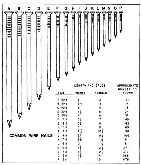 Figure 3-75.-Basic types of nails. The size of a nail is measured in a unit known as a penny. Penny is abbreviated with the lowercase letter d. It indicates the length of the nail. A 6d (6-penny) nail is 2-inches long. A 10d (10-penny) nail is 3-inches long (figure 3-76). These measurements apply to common, box, casing, and finish nails only. Brads and small box nails are identified by their actual length and gauge number. A nail, whatever the type, should be at least three times as long as the thickness of the wood it is intended to hold. Two-thirds of the length of the nail is driven into the other piece of wood for proper anchorage. The other one-third of the length provides the necessary anchorage of the piece being fastened. Protruding nails should be bent over to prevent damage to materials and injury to personnel. There are a few general rules to be followed in the use of nails in building. Nails should be driven at an angle slightly toward each other to improve their holding power. You should be careful in placing nails to provide the greatest holding power. Nails driven with the grain do not hold as well as nails driven across the grain. A few nails of proper type and size, properly placed and properly driven, will hold better than a great many driven close together. Nails can generally be considered the cheapest and easiest fasteners to be applied.
