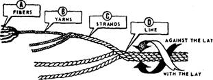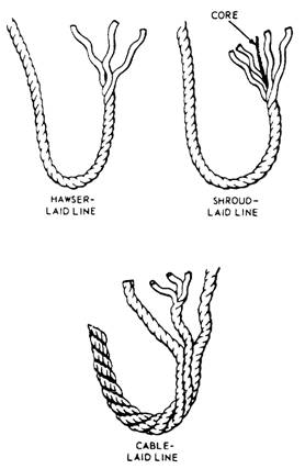 Figure 4-1.-Fiber groupings in a three-strand line. Types of Line Lays There are three types of fiber line lays: hawser-laid, shroud-laid, and cable-laid lines. Each type is illustrated in figure 4-2. Hawser-laid line generally consists of three strands twisted together, usually in a right-hand direction. A shroud-laid line ordinarily is composed of four strands twisted together in a right-hand direction around a center strand, or core, which usually is of the same material, but smaller in diameter than the four strands. You will find that shroud-laid line is more pliable and stronger than hawser-laid line, but it has a strong tendency toward kinking. In most instances, it is used on sheaves and drums. This not only prevents kinking, but also makes use of its pliability and strength. Cable-laid line usually consists of three right-hand, hawser-laid lines twisted together in a left-hand direction. It is especially safe to use in heavy construction work; if cable laid line untwists, it will tend to tighten any regular right-hand screw connection to which it is attached.