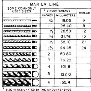 Figure 4-3.-Some commonly used sizes of manila line. has outlived its usefulness. Full your yarn from the middle, away from the ends, or it will get fouled. |
