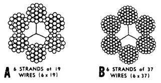 Figure 4-6.-Two common types of wire rope. MEASURING WIRE ROPE The size of wire rope is designated by its diameter. The true diameter of a wire rope is the diameter of a circle that will just enclose all of its strands. Correct and incorrect methods of measuring wire rope are illustrated in figure 4-7. In particular, note that the correct way is to measure from the top of one strand to the top of the strand directly opposite it. The wrong way is to measure across two strands side by side. Use calipers to take the measurement. If calipers are not available, an adjustable wrench will do. To ensure an accurate measurement of the diameter of a wire rope, always measure the rope at three places, at least 5 feet apart. Use the average of the three measurements as the diameter of the rope. SAFE WORKING LOAD The term "safe working load" (swl), as used in reference to wire rope, means the load that can be applied and still obtain the most efficient service and also prolong the life of the rope. Most manufacturers provide tables that show the safe working load for their rope under various conditions. In the absence of these tables, you must apply a thumb rule formula to obtain the swl. There are rules of thumb that may be used to compute the strength of wire rope. The one recommended by the Naval Facilities Engineering Command (NAVFAC) is swl (in tons)= DZx 8. This particular formula provides an ample safety margin to account for such variables as the number, size, and location of sheaves and drums on which the rope runs. Also included are dynamic stresses, such as the speed of operation and the acceleration and deceleration of the load. All can affect the endurance and breaking strength of the rope. Let's work an example. In the above formula, D represents the diameter of the rope in inches. Suppose you want to find the swl of a 2-inch rope. Using the formula above, your figures would be: swl = 2'x 8, or 4 x 8 = 32. The answer is 32, meaning that the rope has a swl of 32 tons. It is very important to remember that any formula for determining swl is only a rule of thumb. In computing the swl of old rope, worn rope, or rope that is otherwise in poor condition, you should reduce the swl as much as 50 percent, depending on the condition of the rope. The manufacturer's data concerning the breaking strength (BS) of wire rope should be used if available. But if you do not have that information, one rule of thumb recommended is BS = C2x 8,000 pounds. As you recall, wire rope is measured by the diameter (D). To obtain the circumference (C) required in the formula, multiply D by pi (usually shown by the Greek letter 7t), which is approximately 3.1416. Thus, the formula to find the circumference is C = Dir. |