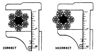 Figure 4-7.-Correct and incorrect methods of measuring wire rope.