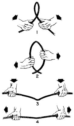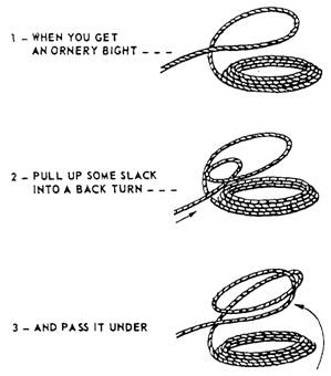 Figure 4-8.-Throwing a back turn to make wire lie down. HANDLING AND CARE OF WIRE ROPE To render safe, dependable service over a maximum period of time, wire rope must have the care and upkeep necessary to keep it in good condition. In this section, we'll discuss various ways of caring for and handling wire rope. Not only should you study these procedures carefully, you should also practice them on your job to help you do a better job now. In the long run, the life of the wire rope will be longer and more useful. Coiling and Uncoiling Once a new reel has been opened, it may be either coiled or faked down like line. The proper direction of coiling is counterclockwise for left-laid wire rope and clockwise for right-laid rope. Because of the general toughness and resilience of wire, however, it occasionally tends to resist being coiled down. When this occurs, it is useless to fight the wire by forcing down a stubborn turn; it will only spring up again. But if it is thrown in a back turn, as shown in figure 4-8, it will lie down properly. A wire rope, when faked down, will run right off like line; but when wound in a coil, it must always be unwound. Wire rope tends to kink during uncoiling or unreeling, especially if it has been in service for a long time. A kink can cause a weak spot in the rope, which will wear out quicker than the rest of the rope. A good method for unreeling wire rope is to run a pipe or rod through the center and mount the reel on drum jacks or other supports so the reel is off the ground or deck (figure 4-9.) In this way, the reel will turn as the rope is unwound, and the rotation of the reel will help keep the rope straight. During unreeling, pull the rope straight forward, as shown in figure 4-9, and try to avoid hurrying the operation. As a safeguard against kinking, never unreel wire rope from a stationary reel. To uncoil a small coil of wire rope, simply stand the coil on edge and roll it along the ground or deck like a wheel or hoop, as illustrated in figure 4-9. Never lay the coil flat on the deck or ground and uncoil it by pulling on the end because such practice can kink or twist the rope. To rewind wire rope back onto a reel or a drum, you may have difficulty unless you remember that it tends to roll in the direction opposite the lay. For example, a right-laid wire rope tends to roll to the left.