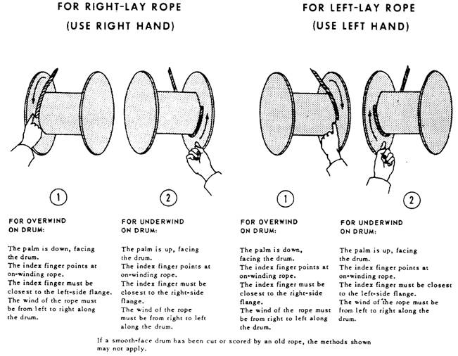 Figure 4-10.-Drum windings diagram for selecting the proper lay of rope. Carefully study figure 4-10, which shows drum-winding diagrams selecting the proper lay of rope. When putting wire rope onto a drum, you should have no trouble if you know the methods of overwinding and underwinding shown in the illustration. When wire rope is run off one reel onto another, or onto a winch or drum, it should be run from top to top or from bottom to bottom, as shown in figure 4-11. Kinks If a wire rope should forma loop, never try to pull it out by putting strain on either part. As soon as a loop is noticed, uncross the ends by pushing them apart. (See steps 1 and 2 in figure 4-12.) This reverses the process that started the loop. Now, turn the bent portion over and place it on your knee or some firm object and push downward until the loop straightens out somewhat. (See step 3 in figure 4-12.) Then, lay the bent portion on a flat surface and pound it smooth with a wooden mallet. (See step 4 in figure 4-12.) If a heavy strain has been put on a wire rope with a kink in it, the rope can no longer be trusted. Replace the wire rope altogether.