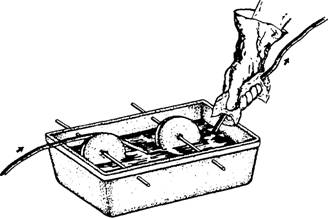 Figure 4-12.-The correct way to takeout a loop in wire rope. Lubrication Used wire rope should be cleaned at frequent intervals to remove any accumulation of dirt, grit, rust, or other foreign matter. The frequency of cleaning depends on how much the rope is used. However, rope should always be well cleaned before lubrication. The rope can be cleaned by wire brushes, compressed air, or steam. Do not use oxygen in place of compressed air; it becomes very dangerous when it comes in contact with grease or oil. The purpose is to remove all old lubricant and foreign matter from the valleys between the strands and from the spaces between the outer wires. This gives newly applied lubricant ready entrance into the rope. Wire brushing affords a good opportunity to find any broken wires that may otherwise go unnoticed. Wire rope is initially lubricated by the manufacturer, but this initial lubrication isn't permanent and periodic reapplications have to be made by the user. Each time a wire rope bends and straightens, the wires in the strands and the strands in the rope slide upon each other. To prevent the rope wearing out by this sliding action, a film of lubricant is needed between the surfaces in contact. The lubricant also helps prevent corrosion of the wires and deterioration of fiber centers. A rusty wire rope is a liability! With wire rope, the same as with any machine or piece of equipment, proper lubrication is essential to smooth, efficient performance. The lubricant should be a good grade of lubricating oil, free from acids and corrosive substances. It must also be of a consistency that will penetrate to the center of the core, yet heavy enough to remain as a coating on the outer surfaces of the strands. Two good lubricants for this purpose are raw linseed oil and a medium graphite grease. Raw linseed oil dries and is not greasy to handle. Graphite grease is highly resistant to saltwater corrosion. Of course, other commercial lubricants may be obtained and used. One of the best is a semiplastic compound that is thinned by heating before being applied. It penetrates while hot, then cools to a plastic filler, preventing the entrance of water. One method of applying the lubricant is by using a brush. In doing so, remember to apply the coating of fresh lubricant evenly and to work it in well. Another method involves passing the wire rope through a trough or box containing hot lubricant (figure 4-13). In this method, the heated lubricant is placed in the trough, and the rope passed over a sheave, through the lubricant, and under a second sheave. Hot oils or greases have very good penetrating qualities. Upon cooling, they have high adhesive and film strength around each wire. As a safety precaution, always wipe off any excess when lubricating wire rope. This is especially important where heavy equipment is involved. Too much lubricant can get on brakes or clutches, causing them to fail. While in use, the motion of machinery