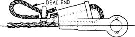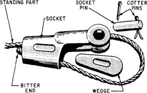 Figure 4-14.-Parts of a wedge socket. lead enough of it back through the socket to allow a minimum of 6 to 9 inches of the bitter end to extend below the socket. Next, replace the wedge, and haul on the bitter end of the wire rope until the bight closes around the wedge, as shown in figure 4-15. A strain on the standing part will tighten the wedge. You need at least 6 to 9 inches on the dead end (the end of the line that doesn't carry the load). Finally, place one wire rope clip on the dead end to keep it from accidentally slipping back through the wedge socket. The clip should be approximately 3 inches from the socket. Use one size smaller clip than normal so that the threads on the U-bolt are only long enough to clamp tightly on one strand of wire rope. The other alternative is to use the normal size clip and hop the dead end back as shown in figure 4-15. Never attach the clip to the live end of the wire rope. The advantage of the wedge socket is that it is easy to remove; just take off the wire clip and drive out the wedge. The disadvantage of the wedge socket is that it reduces the strength of wire rope by about 30 percent. Of course, reduced strength means less safe working load. To make an eye in the end of a wire rope, use new wire rope clips, like those shown in figure 4-16. The U-shaped part of the clip with the threaded ends is called the U-bolt; the other part is called the saddle. The saddle is stamped with the diameter of the wire rope that the clip will fit. Always place a clip with the U-bolt on the bitter end, not on the standing part of the wire rope. If clips are attached incorrectly, the standing part (live end) of the wire rope will be distorted or have mashed spots. An easy way to remember is never saddle a dead horse. You also need to determine the correct number of clips to use and the correct spacing. Here are two simple formulas. 3 x wire rope diameter + 1 = number of clips 6 x wire rope diameter = spacing between clips