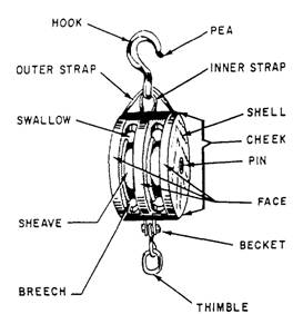 Figure 4-18.-Nomenclature of a fiber line block. BLOCK AND TACKLE LEARNING OBJECTIVE: Upon completing this section, you should be able to identify the components and operating characteristics of block and tackle units.