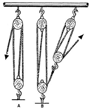 Figure 4-19.-Types of tackle: simple (view A) and compound (view B). A block (figure 4-18) consists of one or more sheaves fitted in a wood or metal frame supported by a shackle inserted in the strap of the block. A tackle (figure 4-19) is an assembly of blocks and lines used to gain a mechanical advantage in lifting and pulling. In a tackle assembly, the line is reeved over the sheave(s) of blocks. The two types of tackle systems are simple and compound. A simple tackle system is an assembly of blocks in which a single line is used (view A of figure 4-19). A compound tackle system is an assembly of blocks in which more than one line is used (view B of figure 4-19). |