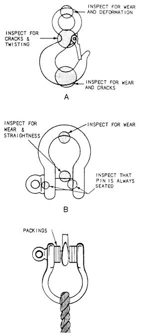 TACKLE SAFETY PRECAUTIONS In hoisting and moving heavy objects with blocks and tackle, stress safety for people and materials. Always check the condition of blocks and sheaves before using them on a job to make sure they are in safe working order. See that the blocks are properly greased. Also, make sure that the line and sheave are the right size for the job. Remember that sheaves or drums that have become worn, chipped, or corrugated must not be used because they will damage the line. Always find out whether you have enough mechanical advantage in the amount of blocks to make the load as easy to handle as possible. Sheaves and blocks designed for use with fiber line must not be used for wire rope since they are not strong enough for that service, and the wire rope does not fit the sheave grooves. Also, sheaves and blocks built for wire rope should never be used for fiber line. HOOKS AND SHACKLES Hooks and shackles are handy for hauling or lifting loads without tying them directly to the object with a line or wire rope. They can be attached to wire rope, fiber line, or blocks. Shackles should be used for loads too heavy for hooks to handle. Hooks should be inspected at the beginning of each workday and before lifting a full-rated load. Figure 4-34, view A, shows where to inspect a hook for wear and strain. Be especially careful during the inspection to look for cracks in the saddle section and at the neck of the hook. When the load is too heavy for you to use a hook, use a shackle. Shackles, like hooks, should be inspected on a daily routine and before lifting heavy loads. Figure 4-34, view B, shows the area to look for wear. You should never replace the shackle pin with a bolt. Never use a shackle with a bent pin, and never allow the shackle to be pulled at an angle; doing so will reduce its carrying capacity. Packing the pin with washers centralizes the shackle (figure 4-34, view B).