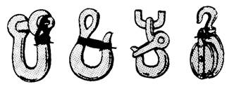 Figure 4.34.-Hook and shackle inspection (views A and B) and packing a shackle with washers. If you need a hook or shackle for a job, always get it from Alfa Company. This way, you will know that it has been load tested. Mousing is a technique often used to close the open section of a hook to keep slings, straps, and so on, from slipping off the hook (figure 4-35). To some extent, it also helps prevent straightening of the hook. Hooks may be moused with rope yarn, seizing wire, or a shackle. When using rope yarn or wire, make 8