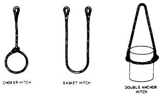 Figure 4-37.-Ways of hitching on straps. Before the hoist signal is given, the person in charge should be sure that the lead of the whip or falls is vertical. If it is not, the load will take a swing as it leaves the deck or ground. As the load leaves the deck or ground, the person in charge must watch carefully for kinked or fouled falls or slings. If any are observed, the load must be lowered at once for clearing. Tag lines must be used to guide and steady a load when there is a possibility that the load might get out of control. Before any load is hoisted, it must be inspected carefully for loose parts or objects that might drop as the load goes up. All personnel must be cleared from and kept out of any area that is under a suspended load, or over which a suspended load may pass. Never walk or run under a suspended load. Loads must not be placed and left at any point closer than 4 feet 8 inches from the nearest rail