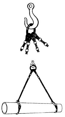 SAFETY RULES The following safety rules must be given to all hands engaged in hooking on. They must be strictly observed. The person in charge of hooking on must know the safe working load of the rig and the weight of every load to be hoisted. The hoisting of any load heavier than the safe working load of the rig is absolutely prohibited. When a cylindrical metal object, such as a length of pipe, a gas cylinder, or the like, is hoisted in a choker bridle, each leg of the bridle should be given a round turn around the load before it is hooked or shackled to its own part or have a spreader bar placed between the legs. The purpose of this is to ensure that the legs of the bridle will not slide together along the load, thereby upsetting the balance and possibly dumping the load. The point of strain on a hook must never be at or near the point of the hook. Before the hoist signal is given, the person in charge must be sure that the load will balance evenly in the sling.