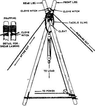 Figure 4-39.-Shear legs. The next step is to form the sling for the hoisting falls. To do this, take a short length of line, pass it a sufficient number of times over the cross at the top of the shears, and tie the ends together. Then, reeve a set of blocks and place the hook of the upper block through the sling, and secure the hook by mousing the open section of the hook with rope yarn to keep it from slipping off the sling. Fasten a snatch block to the lower part of one of the legs, as indicated in figure 4-39. The guys-one forward guy and one after guy-are secured next to the top of the shears. Secure the forward guy to the rear leg and the after guy to the front leg using a clove hitch in both instances. If you need to move the load horizontally by moving the head of the shears, you must rig a tackle in the after guy near its anchorage. |