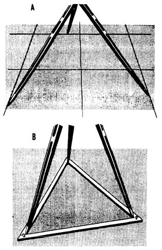 Figure 5-5.-Methods of preventing tripod legs from spreading. two good ways of doing this. In view A, the tips of the legs are inserted in joints in the pavement. In view B, the tips are held by a wooden floor triangle. LEVELING A LEVEL To function accurately, the level must provide a line of sight that is perfectly horizontal in any direction the telescope is trained. To ensure this, you must level the instrument as discussed in the next paragraphs. When the tripod and instrument are first set up, the footplate should be made as nearly level as possible. Next, train the telescope over a pair of diagonally opposite leveling screws, and clamp it in that position. Then, manipulate the leveling thumbscrews, as shown in figure 5-6, to bring the bubble in the level vial exactly into the marked center position. The thumbscrews are manipulated by simultaneously turning them in opposite directions, which shortens one spider leg (threaded member running through the thumbscrew) while it lengthens the other. It is helpful to remember that the level vial bubble will move in the same direction that your left thumb moves while you rotate the thumbscrews. In other words, when your left thumb pushes the thumbscrew clockwise, the bubble will move towards your left hand; when you turn the left thumbscrew counterclockwise, the bubble moves toward your right hand. After leveling the telescope over one pair of screws, train it over the other pair and repeat the process. As a check, set the telescope in all four possible positions and be sure that the bubble centers exactly in each. Various techniques for using the level will develop with experience; however, in this section we will only discuss the techniques that we believe are essential to the Builder rating.