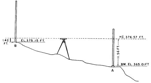 DIFFERENTIAL LEVELING LEARNING OBJECTIVE: Upon completing this section, you should be able to determine elevations in the field to locate points at specified elevations. The most common procedure for determining elevations in the field, or for locating points at specified elevations, is known as differential leveling. This procedure, as its name implies, is nothing more than finding the vertical difference between the known or assumed elevation of a bench mark and the elevation of the point in question. Once the difference is measured, it can (depending on the circumstances) be added to or subtracted from the bench mark elevation to determine the elevation of the new point. ELEVATION AND REFERENCE The elevation of any object is its vertical distance above or below an established height on the earth's surface. This established height is referred to as either a "reference plane" or "simple reference." The most commonly used reference plane for elevations is mean (or average) sea level, which has been assigned an assumed elevation of 000.0 feet. However, the reference plane for a construction project is usually the height of some permanent or semipermanent object in the immediate vicinity, such as the rim of a manhole cover, a rod, or the finish floor of an existing structure. This object may be given its relative sea level elevation (if it is known); or it may be given a convenient, arbitrarily assumed elevation, usually a whole number, such as 100.0 feet. An object of this type, with a given, known, or assumed elevation, which is to be used in determining the elevations of other points, is called a bench mark. PRINCIPLES OF DIFFERENTIAL LEVELING Figure 5-15 illustrates the principle of differential leveling. The instrument shown in the center represents an engineer's level. This optical instrument provides a perfectly level line of sight through a telescope, which can be trained in any direction. Point A in the figure is a bench mark (it could be a concrete monument, a wooden stake, a sidewalk curb, or any other object) having a known elevation of 365.01 feet. Point B is a ground surface point whose elevation is desired. The first step in finding the elevation point of point B is to determine the elevation of the line of sight of the instrument. This is known as the height of instrument and is often written and referred to simply as "H.I." To determine the H.I., you take a backsight on a level rod held vertically on the bench mark (B.M.) by a rodman. A backsight (B.S.) is always taken after a new instrument position is set up by sighting back to a known elevation to get the new H.I. A leveling rod is graduated upward in feet, from 0 at its base, with appropriate subdivisions in feet. In figure 5-15, the backsight reading is 11.56 feet. Thus, the elevation of the line of sight (that is, the H.I.) must be 11.56 feet greater than the bench mark elevation, point A. Therefore, the H.I. is 365.01 feet plus 11.56 feet, or 376.57 feet as indicated. Next, you train the instrument ahead on another rod (or more likely, on the same rod carried ahead) held vertically on B. This is known as taking a foresight. After reading a foresight (F.S.) of 1.42 feet on the rod, it follows that the elevation at point B must be 1.42 feet lower than the H.I. Therefore, the elevation of point B is 376.57 feet minus 1,42 feet, or 375.15 feet. GRADING The term "grade" is used in several different senses in construction. In one sense, it refers to the steepness of a slope; for example, a slope that rises 3 vertical feet for every 100 horizontal feet has a grade of 3 percent. Although the term "grade" is commonly used in this sense, the more accurate term for indicating steepness of slope is "gradient." In another sense, the term "grade" simply means surface. On a wall section, for example, the line that