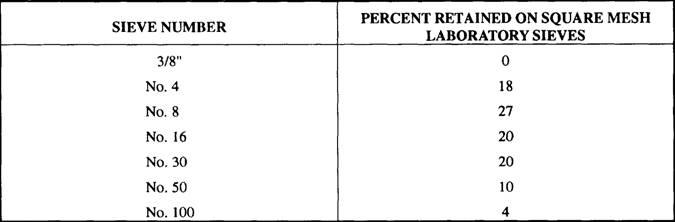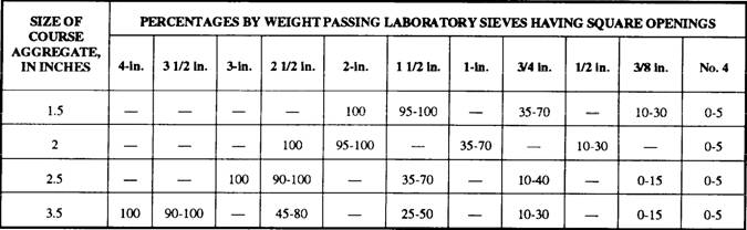 AGGREGATES The material combined with cement and water to make concrete is called aggregate. Aggregate makes up 60 to 80 percent of concrete volume. It increases the strength of concrete, reduces the shrinking tendencies of the cement, and is used as an economical filler. Types Aggregates are divided into fine (usually consisting of sand) and coarse categories. For most building concrete, the coarse aggregate consists of gravel or crushed stone up to 1 1/2 inches in size. However, in massive structures, such as dams, the coarse aggregate may include natural stones or rocks ranging up to 6 inches or more in size. Purpose of Aggregates The large, solid coarse aggregate particles form the basic structural members of the concrete. The voids between the larger coarse aggregate particles are filled by smaller particles. The voids between the smaller particles are filled by still smaller particles. Finally, the voids between the smallest coarse aggregate particles are filled by the largest fine aggregate particles. In turn, the voids between the largest fine aggregate particles are filled by smaller fine aggregate particles, the voids between the smaller fine aggregate particles by still smaller particles, and soon. Finally, the voids between the finest grains are filled with cement. You can see from this that the better the aggregate is graded (that is, the better the distribution of particles sizes), the more solidly all voids will be filled, and the denser and stronger will be the concrete. The cement and water form a paste that binds the aggregate particles solidly together when it hardens. In a well-graded, well-designed, and well-mixed batch, each aggregate particle is thoroughly coated with the cement-water paste. Each particle is solidly bound to adjacent particles when the cement-water paste hardens. AGGREGATE SIEVES.- The size of an aggregate sieve is designated by the number of meshes to the linear inch in that sieve. The higher the number, the finer the sieve. Any material retained on the No. 4 sieve can be considered either coarse or fine. Aggregates huger than No. 4 are all course; those smaller are all fines. No. 4 aggregates are the dividing point. The finest coarse-aggregate sieve is the same No. 4 used as the coarsest fine-aggregate sieve. With this exception, a coarse-aggregate sieve is designated by the size of one of its openings. The sieves commonly used are 1 1/2 inches, 3/4 inch, 1/2 inch, 3/8 inch, and No. 4. Any material that passes through the No. 200 sieve is too fine to be used in making concrete. PARTICLE DISTRIBUTION.- Experience and experiments show that for ordinary building concrete, certain particle distributions consistently seem to produce the best results. For tine aggregate, the recommended distribution of particle sizes from No. 4 to No. 100 is shown in table 6-1. The distribution of particle sizes in aggregate is determined by extracting a representative sample of the material, screening the sample through a series of sieves ranging in size from coarse to fine, and determining the percentage of the sample retained on each sieve. This procedure is called making a sieve analysis. For example, suppose the total sample weighs 1 pound. Place this on the No. 4 sieve, and shake the sieve until nothing more goes through. If what is left on the sieve weighs 0.05 pound, then 5 percent of the total sample is retained on the No. 4 sieve. Place what passes through on the No. 8 sieve and shake it. Suppose you find that what stays on this sieve weighs 0.1 pound. Since 0.1 pound is 10 percent of 1 pound, 10 percent of the total sample was retained on the No. 8 sieve. The cumulative retained weight is 0.15 pound. By dividing 0.15 by 1.0 pound, you will find that the total retained weight is 15 percent. The size of coarse aggregate is usually specified as a range between a minimum and a maximum size; for example, 2 inches to No. 4, 1 inch to No. 4, Table 6-1.-Recommended Distribution of Particle Sizes