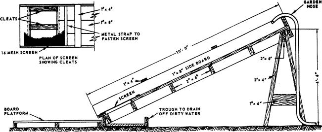 Figure 6-3.-Field-constructed rig for washing aggregate. aggregate. For work in which aggregate strength and durability are of vital importance, such as paving concrete, aggregate must be laboratory tested. Handling and Storage A mass of aggregate containing particles of different sizes has a natural tendency toward segregation. "Segregation" refers to particles of the same size tending to gather together when the material is being loaded, transported, or otherwise disturbed. Aggregate should always be handled and stored by a method that minimizes segregation. Stockpiles should not be built up in cone shapes, formed by dropping successive loads at the same spot. This procedure causes segregation. A pile should be built up in layers of uniform thickness, each made by dumping successive loads alongside each other. If aggregate is dropped from a clamshell, bucket, or conveyor, some of the fine material may be blown aside, causing a segregation of fines on the lee side (that is, the side away from the wind) of the pile. Conveyors, clamshells, and buckets should be discharged in contact with the pile. When a bin is being charged (filled), the material should be dropped from a point directly over the outlet. Material chuted in at an angle or material discharged against the side of a bin will segregate. Since a long drop will cause both segregation and the breakage of aggregate particles, the length of a drop into a bin should be minimized by keeping the bin as full as possible at all times. The bottom of a storage bin should always slope at least 50 toward the central outlet. If the slope is less than 50, segregation will occur as material is discharged out of the bin. WATER The two principal functions of water in a concrete mix are to effect hydration and improve workability. For example, a mix to be poured in forms must contain more water than is required for complete hydration of the cement. Too much water, however, causes a loss of strength by upsetting the wgtercement ratio. It also causes "water-gain" on the surface-a condition that leaves a surface layer of weak material, called laitance. As previously mentioned, an excess of water also impairs the watertightness of the concrete. Water used in mixing concrete must be clean and free from acids, alkalis, oils, and organic materials. Most specifications recommend that the water used in mixing concrete be suitable for drinking, should such water be available. Seawater can be used for mixing unreinforced concrete if there is a limited supply of fresh water. Tests show that the compressive strength of concrete made with Seawater is 10 to 30 percent less than that obtained using fresh water. Seawater is not suitable for use in making steel-reinforced concrete because of the risk of corrosion of the reinforcement, particularly in warm and humid environments. |