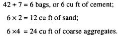 MATERIAL ESTIMATES When tables, such as table 6-3, are not available for determining quantities of material required for 1 cubic yard of concrete, a rule of thumb, known as rule 41 or 42, may be used for a rough estimation. According to this rule, it takes either 41 or 42 cubic feet of the combined dry amounts of cement, sand, and aggregates to produce 1 cubic yard of mixed concrete. Rule 41 is used to calculate the quantities of material for concrete when the size of the coarse aggregate is not over 1 inch. Rule 42 is used when the size of the coarse aggregate is not over 2 1/2 inches. Here is how it works. As we mentioned earlier, a bag of cement contains 94 pounds by weight, or about 1 cubic foot by loose volume. A batch formula is usually based on the number of bags of cement used in the mixing machine. For estimating the amount of dry materials needed to mix 1 cubic yard of concrete, rules 41 and 42 work in the same manner. The decision on which rule to use depends upon the size of the aggregate. Let's say your specifications call for a 1:2:4 mix with 2-inch coarse aggregates, which means you use rule 42, First, add 1:2:4, which gives you 7. Then compute your material requirements as follows: