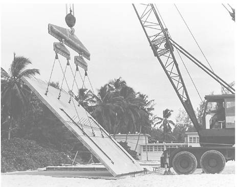READY-MIXED CONCRETE On some jobs, such as large danger of falling highway jobs, it is possible to use a batch plant that contains its own mixer. A plant of this type discharges ready-mixed concrete into transit mixers, which haul it to the construction site. The truck carries the mix in a revolving chamber much like the one on a mixer. Keeping the mix agitated in route prevents segregation of aggregate particles. A readymix plant is usually portable so that it can follow the job along. It must be certain, of course, that a truck will be able to deliver the mix at the site before it starts to set. Discharge of the concrete from the drum should be completed within 11/2 hours. TRANSIT-MIXED CONCRETE By transit-mixing, we refer to concrete that is mixed, either wet or dry, en route to a job site. A transit-mix truck carries a mixer and a water tank from which the driver can, at the proper time, introduce the required amount of water into the mix. The truck picks up the dry ingredients at the batch plant, together with a slip which tells how much water is to be introduced to the mix upon arrival at the site. The mixer drum is kept revolving in route and at the job site so that the dry ingredients do not segregate. Transit-mix trucks are part of the battalion's equipment inventory and are widely used on all but the smallest concrete jobs assigned to a battalion. PRECAST AND TILT-UP CONCRETE LEARNING OBJECTIVE: Upon completing this section, you should be able to determine projects suitable for and lifting methods necessary for precast and tilt-up construction. Concrete cast in the position it is to occupy in the finished structure is called cast-in-place concrete. Concrete cast and cured elsewhere is called precast concrete. Tilt-up concrete is a special type of precast concrete in which the units are tilted up and placed using cranes or other types of lifting devices. Wall construction, for example, is frequently done with precast wall panels originally cast horizontally (sometimes one above the other) as slabs. This method has many advantages over the conventional method of casting in place in vertical wall forms. Since a slab form requires only edge forms and a single surface form, the amount of formwork and form materials required is greatly reduced. The labor involved in slab form concrete casting is much less than that involved in filling a high wall form. One side of a precast unit cast as a slab maybe finished by hand to any desired quality of finishing. The placement of reinforcing steel is much easier in slab forms, and it is easier to attain thorough filling and vibrating. Precasting of wall panels as slabs may be expedited by mass production methods not available when casting in place. Relatively light panels for concrete walls are precast as slabs (figure 6-8). The panels are set in