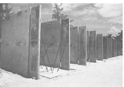 Figure 6-10.-Precast panels in position. economical but only last for a couple of concrete pours. Concrete surfaces, since they can be reused repeatedly, are more practical. When building casting surfaces, you should keep the following points in mind: The subbase should be level and properly compacted. The slab should be at least 6 inches thick and made of 3,000 psi or higher reinforced concrete. Large aggregate, 2 1/2 inches to 3 inches maximum, may be used in the casting slabs. If pipes or other utilities are to be extended up through the casting slab at a later date, they should be stopped below the surface and the openings temporarily closed. For wood, cork, or plastic plugs, fill almost to the surface with sand and top with a thin coat of mortar that is finished flush with the casting surface. It is important to remember that any imperfections in the surface of the casting slab will show up on the cast panels. When finishing the casting slab, you must ensure there is a flat, level, and smooth surface without humps, dips, cracks, or gouges. If possible, cure the casting surface keeping it covered with water (pending). However, if a curing compound or surface hardener is used, make sure it will not conflict with the later use of bond-breaking agents. |