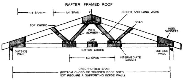 Figure 2-4.-A truss rafter. The engineer works with the architect to decide what materials to use in the structure and the construction methods to follow. The engineer determines the loads that supporting members will carry and the strength qualities the members must have to bear the loads. The engineer also designs the mechanical systems of the structure, such as the lighting, heating, and plumbing systems. The end result is the architectural and engineering design sketches. These sketches guide draftsmen in preparing the construction drawings. |