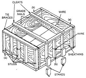 Figure 7-1.-Typical foundation form for a large footing. 1-by-2-inch lumber for the cleats, and space them 2 1/2 inches from each end of the exterior sides of the panels (a), and on 2-foot centers between the ends. Next, nail two cleats to the ends of the interior sides of the second pair of panels (figure 7-1 (b)). The space between these panels should equal the footing length plus twice the sheathing thickness. Then, nail cleats on the exterior sides of the panels (b) spaced on 2-foot centers. Erect the panels into either a rectangle or square, and hold them in place with form nails. Make sure that all reinforcing bars are in place. Now, drill small holes on each side of the center cleat on each panel. These holes should be less than 1/2 inch in diameter to prevent paste leakage. Pass No. 8 or No. 9 black annealed iron wire through these holes and wrap it around the center cleats of the opposing panels to hold them together (see figure 7-1). Mark the top of the footing on the interior side of the panels with grade nails. For forms 4 feet square or larger, drive stakes against the sheathing, as shown in figure 7-1. Both the stakes and the 1 by 6 tie braces nailed across the top of the form keep it from spreading apart. If a footing is less than 1-foot deep and 2-feet square, you can construct the form from 1-inch sheathing without cleats. Simply make the side panels higher than the footing depth, and mark the top of the footing on the interior sides of the panels with grade nails. Cut and