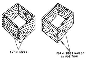 FORM DESIGN Forms for concrete construction must support the plastic concrete until it has hardened. Stiffness is an important feature in forms. Failure to provide form stiffness may cause unfortunate results. Forms must be designed for all the weight to which they are likely to be subjected. This includes the dead load of the forms, the plastic concrete in the forms, the weight of the workmen, the weight of equipment and materials, and the impact due to vibration. These factors vary with each project, but none should be ignored. The ease of erection and removal is also an important factor in the economical design of forms. Platform and ramp structures independent of formwork are sometimes preferred to avoid displacement of forms due to loading and impact shock from workmen and equipment. When concrete is placed in forms, it is in a plastic state and exerts hydrostatic pressure on the forms. The basis of form design, therefore, is the maximum pressure developed by concrete during placing. The maximum pressure developed depends on the placing rate and the temperature. The rate at which concrete is placed affects the pressure because it determines how much hydrostatic head builds up in the form. The hydrostatic head continues to increase until the concrete takes its initial set, usually in about 90 minutes. At low temperatures, however, the initial set takes place much more slowly. This makes it necessary to consider the temperature at the time of placing. By knowing these two factors and the type of form material to be used, you can calculate a tentative design. FORM CONSTRUCTION Strictly speaking, it is only those parts of the form work that directly mold the concrete that are correctly referred to as the "forms." The rest of the formwork consists of various bracing and tying members. In the following discussion on forms, illustrations are provided to help you understand the names of all the formwork members. You should study these illustrations carefully so that you will understand the material in the next section. Foundation Forms The portion of a structure that extends above the ground level is called the superstructure. The portion below the ground level is called the substructure. The parts of the substructure that distribute building loads to the ground are called foundations. Footings are installed at the base of foundations to spread the loads over a larger ground area. This prevents the structure from sinking into the ground. It's important to remember that the footings of any foundation system should always be placed below the frost line. Forms for large footings, such as bearing wall footings, column footings, and pier footings, are called foundation forms. Footings, or foundations, are relatively low in height since their primary function is to distribute building loads. Because the concrete in a footing is shallow, pressure on the form is relatively low. Therefore, a form design based on high strength and rigidity considerations is generally not necessary. SIMPLE FOUNDATION.- Whenever possible, excavate the earth and use it as a mold for concrete footings. You should thoroughly moisten the earth before placing the concrete. If this is not possible, you must construct a form. Because most footings are rectangular or square, you can build and erect the four sides of the form in panels. Make the first pair of opposing panels (figure 7-1 (a)) to exact footing width. Then, nail vertical cleats to the exterior sides of the sheathing. Use at least