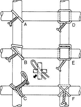WELDED WIRE FABRIC Welded wire fabric, often referred to as "wire mesh," comes in rolls and sheets. These must be cut to tit your individual application. The individual sections of fabric must be tied together, or "lapped," to form a continuous sheet of fabric. Specifications and designs are usually used when wire fabric is being lapped. However, as a rule of thumb, one complete lap is usually sufficient with a minimum of 2 inches between laps. Whenever the rule of thumb is not allowed, use the end lap or side lap method. In the end lap method, the wire mesh is lapped by overlapping one full mesh measured from the end of the longitudinal wires in one piece to the end of longitudinal wires in the adjacent piece. The two pieces are then tied at 1 1/2-foot centers with a snap tie. In the side lap method, the two longitudinal side wires are placed one alongside and overlapping the other and then are tied with a snap tie every 3 feet. REINFORCING STEEL Before placing reinforcing steel in forms, all form oiling should be completed. As mentioned earlier, oil or other coating should not contact the reinforcing steel in the formwork. Oil on reinforcing bars reduces the bond between the bars and the concrete. Use a piece of burlap to clean the bars of rust, scale, grease, mud, or other foreign matter. A light film of rust or mill scale is not objectionable. Rebars must be tied together for the bars to remain in a desired arrangement during pouring. Tying is also a means of keeping laps or splices in place. Laps allow bond stress to transfer the load from one bar, first into the concrete and then into the second bar. Methods of Tying Several types of ties can be used with rebar. Some are more effective than others. The views in figure 7-20 illustrate the six types used by the Seabees: (A) snap, or simple, tie, (B) wall tie, (C) double-strand tie, (D) saddle tie, (E) saddle tie with twist, and (F) cross, or figure-eight, tie. As a Builder, you will probably be concerned only with the snap