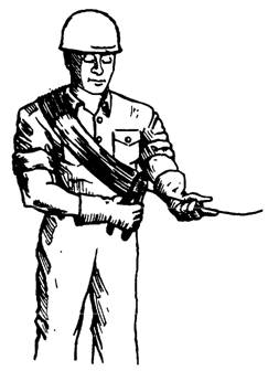 Figure 7-20.-Types of ties. and saddle ties. However, as a professional, you should be familiar with all six types. SNAP, OR SIMPLE, TIE.- The snap, or simple, tie (view A of figure 7-20) is simply wrapped once around the two crossing bars in a diagonal manner with the two ends on top. The ends are then twisted together with a pair of side cutters until they are very tight against the bars. Finally, the loose ends are cut off. This tie is used mostly on floor slabs. WALL TIE.- The wall tie (view B of figure 7-20) is made by taking one and one-half turns around the vertical bar, then one turn diagonally around the intersection. The two ends are twisted together until the connection is tight, then the excess is cut off. The wall tie is used on light vertical mats of steel. DOUBLE-STRAND SINGLE TIE.- The double-strand tie (view C) is a variation of the simple tie. It is favored in some localities and is especially used for heavy work. SADDLE TIE.- The wires of the saddle tie (view D) pass half way around one of the bars on either side of the crossing bar and are brought squarely or diagonally around the crossing bar. The ends are then twisted together and cut off. SADDLE TIE WITH TWIST.- The saddle tie with twist (view E) is a variation of the saddle tie. The tie wire is carried completely around one of the bars, then squarely across and halfway around the other, either side of the crossing bars, and finally brought together and twisted either squarely or diagonally across. The saddle tie with twist is used for heavy mats that are to be lifted by crane. CROSS, OR FIGURE-EIGHT, TIE.- The cross, or figure-eight, tie (view F) has the advantage of causing little or no twist in the bars. CARRYING WIRE.- When tying reinforcing bars, you must have a supply of tie wire available. There are several ways you can carry your tie wire. One way is to coil it to a diameter of 18 inches, then slip it around your neck and under one arm (figure 7-21). This leaves a free end for tying. Coil enough wire so it weighs about 9 pounds. Another way to carry tie wire is to take pieces of wire about 9-inches long, fold them, and hook one end in your belt. Then, you can pull the wires out as needed. The tools you use in tying reinforcing bars include a 6-foot folding rule, side cutters, leather gloves, 50-foot tape measure, and a keel crayon, either yellow, red, or blue.
