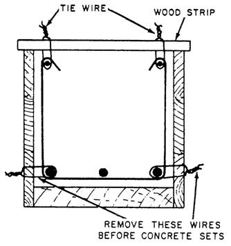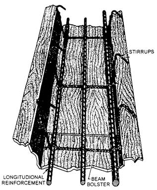 Figure 7-24: Beam-reinforcing steel hung in place. inches of concrete between steel and ground. If the concrete surface is to be in contact with the ground or exposed to the weather after removal of the forms, the protective covering of concrete over the steel should be 2 inches for bars larger than No. 5 and 1 1/2 inches for No. 5 or smaller. The protective covering maybe reduced to 1 1/2 inches for beams and columns and 3/4 inch for slabs and interior wall surfaces, but it should be 2 inches for all exterior wall surfaces. The clear distance between parallel bars in beams, footings, walls, and floor slabs should be a minimum of 1 inch, or one and one-third times the largest size aggregate particle in the concrete. In columns, the clear distance between parallel bars should be a minimum of one and one-half times the bar diameter, one and one-half times the maximum size of the coarse aggregate, or not less than 1 1/2 inches. The support for reinforcing steel in floor slabs is shown in figure 7-25. The height of the slab bolster is determined by the concrete protective cover required. Concrete blocks made of sand-cement mortar can be used in place of the slab bolster. Wood blocks should never be used for this purpose if there is any possibility the concrete might become wet and if the construction is of a permanent type. Bar chairs, like those shown in figure 7-25, are available from commercial sources in heights up to 6 inches. If a height greater than 6 inches is required, make the