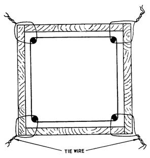 Figure 7-26.-Securing a column with reinforcing steel against displacement. The use of metal supports to hold beamreinforcing steel in position is shown in figure 7-27. Note the position of the beam bolster. The stirrups are tied to the main reinforcing steel with a snap tie. Whenever possible, you should assemble the stirrups and main reinforcing steel outside the form and then place the assembled unit in position. Wood blocks should be substituted for the metal supports only if there is no possibility of the concrete becoming wet or if the construction is known to be temporary. Precast concrete blocks, as shown in figure 7-23, may be substituted for metal supports or, if none of the types of bar supports described above seem suitable, the method shown in figure 7-24 may be used. Placement of steel in walls is the same as for columns except that the steel is erected in place and not preassembled. Horizontal steel is tied to vertical steel at least three times in any bar length. Steel in place in a wall is shown in figure 7-28. The wood block is removed when the form has been filled up to the level of the block. For high walls, ties in between the top and bottom should be used. Steel is placed in footings very much as it is placed in floor slabs. Stones, rather than steel supports, may be used to support the steel at the