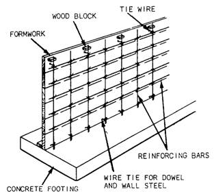 Figure 7-28.-Steel in place in a wall. proper distance above the subgrade. Steel mats are generally preassembled and placed in small footings after the forms have been set. A typical arrangement is shown in figure 7-29. Steel mats in large footings are generally constructed in place. Welded wire fabric (figure 7-30) is also used as limited reinforcement for concrete footings, walls, and slabs, but its primary use is to control crack widths due to temperature changes. Form construction for each job has its peculiarities. However, certain natural conditions prevail in all situations. Wet concrete always develops hydrostatic pressure and strain on forms. Therefore, all stakes,