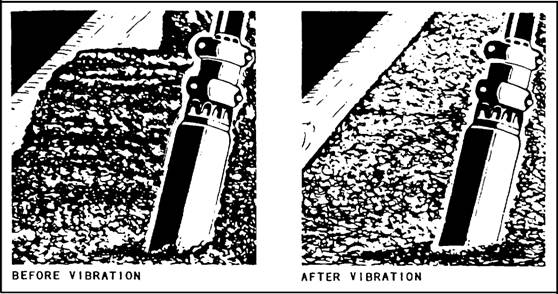 PURPOSE OF CONSOLIDATION Consolidation eliminates rock pockets and air bubbles and brings enough fine material both to the surface and against the forms to produce the desired finish. You can use such hand tools as spades, puddling sticks, or tampers, but mechanical vibrators are best. Any compacting device must reach the bottom of the form and be small enough to pass between reinforcing bars. The process involves carefully working around all reinforcing steel with the compacting device to assure proper embedding of reinforcing steel in the concrete. Since the strength of the concrete member depends on proper reinforcement location, be careful not to displace the reinforcing steel. VIBRATION Vibrators consolidate concrete by pushing the coarse aggregate downward, away from the point of vibration. Vibrators allow placement of mixtures that are too stiff to place any other way, such as those having a 1- or 2-inch slump. Stiff mixtures are more economical because they require less cement and present fewer segregation or bleeding problems. However, do not use a mix so stiff that it requires too much labor to place it. Mechanical Vibrators The best compacting tool is a mechanical vibrator (figure 7-42). The best vibrators available in engineering construction battalions are called internal vibrators because the vibrating element is inserted into the concrete. When using an internal vibrator, insert it at approximately 18-inch intervals into air-entrained concrete for 5 to 10 seconds and into nonair-entrained concrete for 10 to 15 seconds. The exact period of time that you should leave a vibrator in the concrete depends on its slump. Overlap the vibrated areas somewhat at each insertion. Whenever possible, lower the vibrator into the concrete vertically and allow it to descend by gravity. The vibrator should not only pass through the layer just placed, but penetrate several inches into the layer underneath to ensure a good bond between the layers. Vibration does not normally damage the lower layers, as long as the concrete disturbed in these lower layers becomes plastic under the vibrating action. You know that you have consolidated the concrete properly when a thin line of mortar appears along the form near the vibrator, the coarse aggregate disappears into the concrete, or the paste begins to appear near the vibrator head. Then, withdraw the vibrator vertically at about the same gravity rate that it descended. Some hand spading or puddling should accompany all vibration. To avoid the possibility of segregation, do not vibrate mixes that you can consolidate easily by spading. Also, don't vibrate concrete that has a slump of 5 inches or more. Finally, do not use vibrators to move concrete in the form. Hand Methods Manual consolidation methods require spades, puddling sticks, or various types of tampers. To