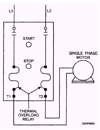 Figure 7-32.- Split-phase motor data sheet. Clean the old insulation and varnish from the slots before installing the new slot insulators. This cleaning is usually done with a torch. The slot insulators are formed from one of several types of material available for this purpose. The best procedure is to reinsulate the slots with the same type and size insulation that was used in the original winding. The coils are then wound according to the data sheet and replaced in the slots in the same position as the windings that were removed. The starting windings are ALWAYS placed 90 electrical degrees out of phase with the running windings. When all the connections between the poles of the windings have been completed and tested and the leads attached, the stator should be placed in a baking oven at a temperature of about 250 F and baked for three hours to remove any trace of moisture. Heating the windings also helps the varnish to penetrate the coils. The stator is then dipped in a good grade of insulating varnish, allowed to drip for about an hour and then placed in the oven and baked for several hours. When the stator is removed from the oven, the inner surface of the core of the stator should be scraped to remove the varnish so that the rotor will have sufficient space to rotate freely. Control for a Split-Phase Motor The control switch for a split-phase motor is usually a simple OFF and ON switch if the motor is equipped with an overload device. If the motor does not have this overload device, the switch will be of a type illustrated in figure 7-33. This type of switch has two push buttons; one to start and one to stop the motor. It uses interchangeable thermal overload relay heaters for protection of various size motors. In some cases, a 30- ampere safety switch with the proper size fuse may be used. CAPACITOR MOTORS The capacitor motor is similar to the split-phase motor, but an additional unit, called a capacitor, is connected in series with the starting winding, These motors may be of capacitor-start or the capacitor-run type. The capacitor is usually installed on top of the motor; but it may be mounted on the end of the motor