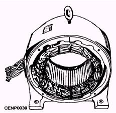 Figure 7-39.- Three-phase stator. SPEED CONTROL OF UNIVERSAL FAN MOTORS The universal fan motor has a resistance unit in the base to vary the speed. A lever that extends outside the base is used to insert the resistance in the circuit. CONSTRUCTION OF THREE-PHASE MOTORS Construction of a three-phase motor consists of three main parts: stator, rotor, and end bells. Its construction is similar to a split-phase motor, but the three-phase motor has no centrifugal switch (fig. 7-38). STATOR The stator, as shown in figure 7-39, consists of a frame and a laminated steel core, like that used in split-phase and repulsion motors, and a winding formed of individual coils, placed in slots. ROTOR The rotor may be a die-cast aluminum squirrel-cage type or a wound type. Both types contain a laminated core pressed onto a shaft. The squirrel-cage rotor (fig. 7-40) is like the rotor of a split-phase motor. The wound