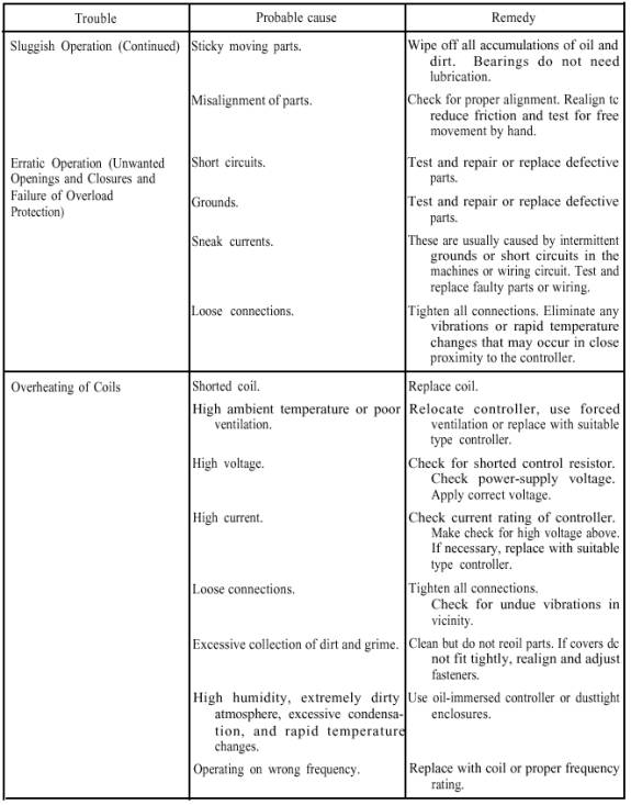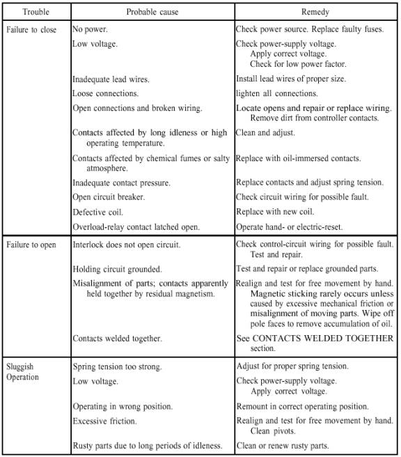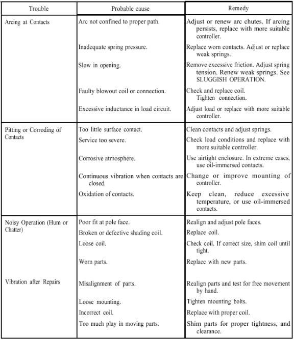 WEAR ALLOWANCE.- A contact is service as long as its wear allowance, and its associated contacts, exceeds the minimum value specified by the manufacturer. (Usually the minimum value is 0.015 to 0.030 inch). The "wear allowance" of contacts is defined as the total thickness of contact material which may be worn away before the contact of two associated surfaces becomes inadequate to carry rated current. In an electric-motor contactor, the wear allowance of the power pole contacts is usually related to the closed position of the magnetic operator. The wear allowance of the power pole contacts of a magnetic contactor is the amount of silver that can be worn away without resulting in failure of the contacts to touch when the magnetic operator is at its closed position. Blowout Coils Blowout coils seldom wear out or give trouble when used within their rating. However, if they are required to carry excessive currents, the insulation becomes charred and fails, causing flashovers and failure of the device. Arc shields are constantly subjected to the intense heat of arcing and may eventually burn away, allowing the arc to short-circuit to the metal blowout pole pieces. Therefore, arc shields should be inspected regularly and renewed before they burn through. Arc barriers provide insulation between electrical circuits and must be replaced if broken or burned to a degree where short circuits are likely to occur. The importance of having clean, tight electrical connections must be emphasized. Where practical, it is a good idea and common practice to solder electrical connections. Excessive slamming on closing, particularly on ac magnetic-operated devices, will eventually damage the laminated face of the magnetic armature and may damage the shading coil. Magnetic coils should be kept dry. Wet coils should always be dried out before using. They may be dried by baking them in a well-vented oven at not more than 194 F to prevent water from boiling in the insulation. The length of time in the oven depends on the size of the coil. If an oven isn't available, place the unit under a canvas cover roomy enough for hot air to be circulated within. Another alternative is to direct infrared lamps on the windings. The closed pressure of contacts is an important factor in their ability to carry current. A small contact with proper contact pressure carries more current than a large one with little pressure. Contact springs must be kept in condition. Replace them when they have been damaged or have lost temper by exposure to high temperatures. Connections should always be clean and tight. Loose connections result in overheated parts that eventually need replacing. Periodic inspections are necessary because temperature changes, vibration, and carelessness may loosen the connections. Inspect the movable core of a controller for cleanliness. Accumulated dirt causes sluggish mechanical action which impairs the opening and closing of the contact. Noise results if the movable and stationary pole pieces don't fit together well when the contactor is closed or when dirt or rust prevents proper closure. The most prominent noise produced in a controller comes from a broken shaded pole, which is a single turn of wire or strap, imbedded in part of the laminated magnetic structure. Check the cabinet which houses the controller for cleanliness. Make sure the cover fits properly to keep moisture, dirt, and dust from entering. Check for corrosion of all metal parts. Table 7-5 is a guide for troubleshooting ac controllers. Table 7-5.- Troubleshooting chart lor alternating-current controllers