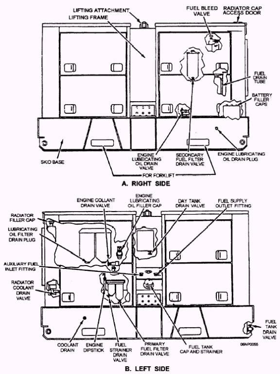 CHAPTER 3 POWER GENERATION Generators play an important part in your assignment with the Seabees. Whether operating a generator as a main power source or as standby power or as emergency power, you need a through knowledge of their hookup, operation, and maintenance. At the completion of this chapter, you should know how to install generators of the advanced-base type, stand a generator watch, perform preventive maintenance, and make minor repairs on power generators and control equipment. Theory for both dc and ac generators is included in Navy Electricity and Electronics Training Series (NEETS), Module 5. Generator theory will not be covered in this chapter. Keep in mind that the generator (alternator) in an automobile works on the same principle as does the huge turbine generator used in a nuclear power station. INSTALLATION AND SERVICING GENERATORS Most of the generators you are likely to work with in the Naval Construction Force (NCF) range in size from 5 kW to 200 kW. Generators in these sizes range in weight from 488 pounds (221.4 kg) to 10,500 pounds (4770 kg). All of these units are mounted on skid bases. Lifting and tie-own attachments are provided. All have provisions for lifting with a forklift of the appropriate capacity (with the exception of the 5-kW gas-driven generator set, which does not include the forklift provision). Several factors should be considered before a final decision is made about where to locate a generator. The noise levels of generators sized from 5 kW to 200 kW range from 77 dBa to 93 dBa (adjusted decibels) at 25 feet. Generator noise is a problem in low-noise level or quiet areas (libraries, offices, hospitals, chapels, etc.). The operating 60-kW generator, for example, presents a noise hazard (84 dBa to 91 dBa, depending on the model) to all personnel in the immediate area. The noise level near the unit exceeds the allowable limits for unprotected personnel. Therefore, everyone working around the generator needs single (noise < 84 dBa) or double hearing protection (noise > 104 dBa). Placing a generator set near points of large demand will reduce the size of wire required, hold the line losses to a minimum, and afford adequate voltage control at the remote ends of the lines. The following points should be considered before an exact site is chosen for a generator set: