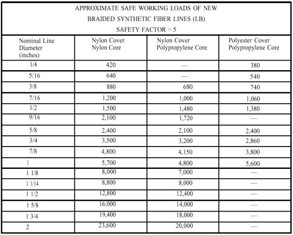 APPROXIMATE SAFE WORKING LOADS OF NEW FIBER LINES - POUNDS Three-Strand Line Safety Factor = 5 Nominal Line Manila Nylon Polypropylene Polyester Polyethylene Diameter (inches) Nominal Line Diameter (inches) 1/ 4 Table 1-3.- Safe Working Load of Braided Synthetic Fiber Line