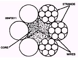 Figure 1-3.- Parts of a wire rope. of larger wires is more resistant to external abrasion but is less flexible. The CORE, the element around which the strands are laid to form the wire rope, may be of hard fiber, such as manila, hemp, plastic, paper, or sisal. Also, a wire-strand core may be used. Each type of core serves the same basic purpose- to support the strands laid around it. A FIBER CORE offers the advantage of increased flexibility. Also, it serves as a cushion to reduce the effects of sudden strain and acts as a reservoir for the oil to lubricate the wires and strands to reduce friction between them. Wire rope with a fiber core is used in places where flexibility of the wire rope is important. A WIRE-STRAND CORE not only resists heat better than a fiber core but it also adds about 15 percent to the strength of the wire rope. On the other hand, the wire strand makes the wire rope less flexible than a fiber core would. An INDEPENDENT WIRE-ROPE CORE is a separate wire rope over which the main strands of the wire rope are laid. It usually consists of six seven-wire strands laid around either a fiber core or a wire-strand core. This core strengthens the wire rope more, provides support against crushing, and supplies maximum resistance to heat. Wire rope may be made by either of two methods. If the strands or wires are shaped to conform to the curvature of the finished wire rope before laying up, the wire rope is termed preformed. If they are not shaped before fabrication, the wire rope is termed nonpreformed. When cut, preformed wire rope tends not to unlay, and it is more flexible than nonpreformed wire rope. With nonpreformed wire rope, twisting produces a stress in the wires; and, when it is cut or broken, the stress causes the strands to unlay. In nonpreformed wire rope, unlaying is rapid and almost instantaneous, which could cause serious injury to someone not familiar with it. The main types of wire rope used by the Navy have 6, 7, 12, 19, 24, or 37 wires in each strand. Usually, the wire rope has six strands laid around a fiber or steel center. Two common types of wire rope, 6 by 19 and 6 by 37 wire rope, are shown in figure 1-4. The 6 by 19 type of wire rope, having six strands with 19 wires in each strand, is commonly used for rough hoisting and skidding work where abrasion is likely to occur. The 6 by 37 wire rope, having six strands with 37 wires in each strand, is the most flexible of the standard six-strand wire ropes. For that reason, it is particularly suitable when you are going to use small sheaves and drums, such as are used on cranes and similar machinery. |