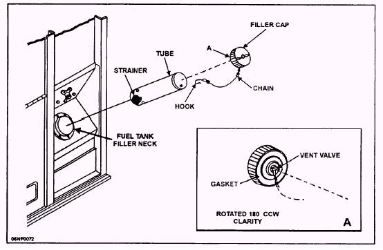 Figure 3-17.- Fuel filler cap and strainer for loose or broken clamps and general secureness of the muffler. Check all pipes and ducts associated with the exhaust system for holes, dents, signs of extreme corrosion, and metallic deterioration. Also, check for loose and broken bolts. Check the exhaust ram cap for signs of corrosion and freedom of movement. Check the breather tube and associated hoses for loose clamps, holes in the hoses, and loose bolts. 4. Cooling system. Check all hoses for cracks, cuts, signs of deterioration, and bulges (indicating the possibility of future rupture). Check all clamps for tightness and signs of corrosion. WARNING Do not attempt to remove the radiator cap until the radiator has cooled to a point where there will be no built-up steam pressure. Failure to observe this warning could result in second-or third-degree burns.