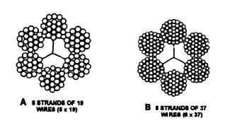 Figure 1-4.- Two types of wire rope. a 1/ 2-inch-diameter wire rope. Using the formula above, you would solve the problem as follows: SWL = (1/ 2) 2 x 8 SWL = 2 tons
