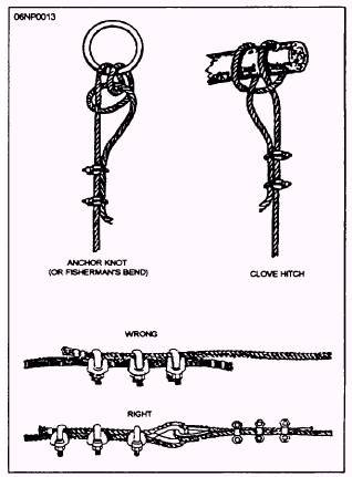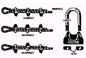 Figure 1-6.- Use of wire-rope clips. there are clips. Pay particular attention to the wire at the clip farthest from the eye, as vibration and whipping are heaviest here and fatigue breaks are likely to occur. To obtain maximum strength in the temporary eye splice, use the correct size and number of wire clips. The size is stamped on the saddle between the two holes. A rule of thumb for determining the number of clips required for various sizes of wire rope is to multiply the diameter of the wire rope by 3 and add 1. Stated as a formula, this means 3D + 1 = number of clips. For example, if the wire rope has a diameter of 1 inch, determine the number of clips as follows: (3 x 1) + 1 = 4 clips In case the answer contains a fraction, then use the next largest whole number. For example, suppose you want to find the number of clips for a wire rope 1/ 2 inch in diameter. Using the formula, the answer would be 2 1/ 2 clips. You simply use the next whole number to get the correct answer. You should space the clips properly to provide a good hold on the wire rope. You can determine the correct distance between the clips by multiplying 6 times the diameter of the wire rope. Where D is equal to