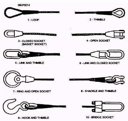 Figure 1-8.- Wire-rope fittings. the diameter, 6 x D = DISTANCE BETWEEN CLIPS. Here, as in determining the number of clips, if the answer contains a fraction, use the next whole number. You should inspect and tighten wire-rope clips at regular intervals. Also, after comparatively long use, remove the clips and examine the wire rope for broken wires. If any are present, remove the damaged part and make a new attachment. |