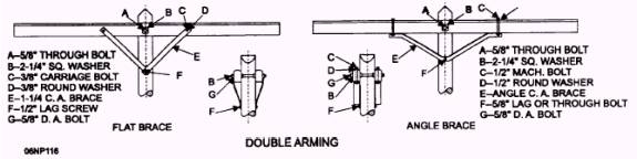 CROSSARM BRACES Braces are used to give strength and rigidity to the crossarm. Metal crossarm braces are made of either flat bar or light angle iron. The size used varies with the size of the arm and the weight of the conductors. The usual flat-strap brace for ordinary distribution work (fig. 4-17) is 38 inches long and 1/ 4 by 1 1/ 4 inches. One end is attached to the crossarm by means of a carriage bolt and the other to the pole by means of a lag screw.