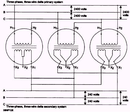 DISTRIBUTION TRANSFORMERS Distribution transformers are installed in the vicin-ity of each customer to reduce the voltage of the distri-bution circuit to a usable voltage, usually 120/ 240 volts. DISTRIBUTION CIRCUITS Distribution circuits (primary main circuits) are circuits that originate from the distribution substation. Primary mains are circuits carrying over 600 volts, but generally they operate between 2,400 and 34,500 volts. Primaries can be found in single-phase or three-phase configurations and generally operate as three-phase, three-wire or three-phase, four-wire circuits. Two types of primary circuits are in use today. One, the delta type (A) system, (fig. 4-29) is used when most of the load in